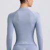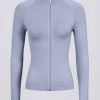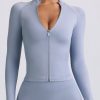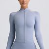 Functional comfort. Made from our breathable, moisture-wicking and lightweight Define Luxe fabric, this jacket is perfect for everyday workouts, outdoor activities and running errands. Designed for a second-skin fit, it features underbust contouring and compressive ribbed panels along each side, creating a sculpted look. It has a high collared neckline for extra protection against the elements and a signature Bo+Tee logo at the back.