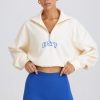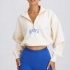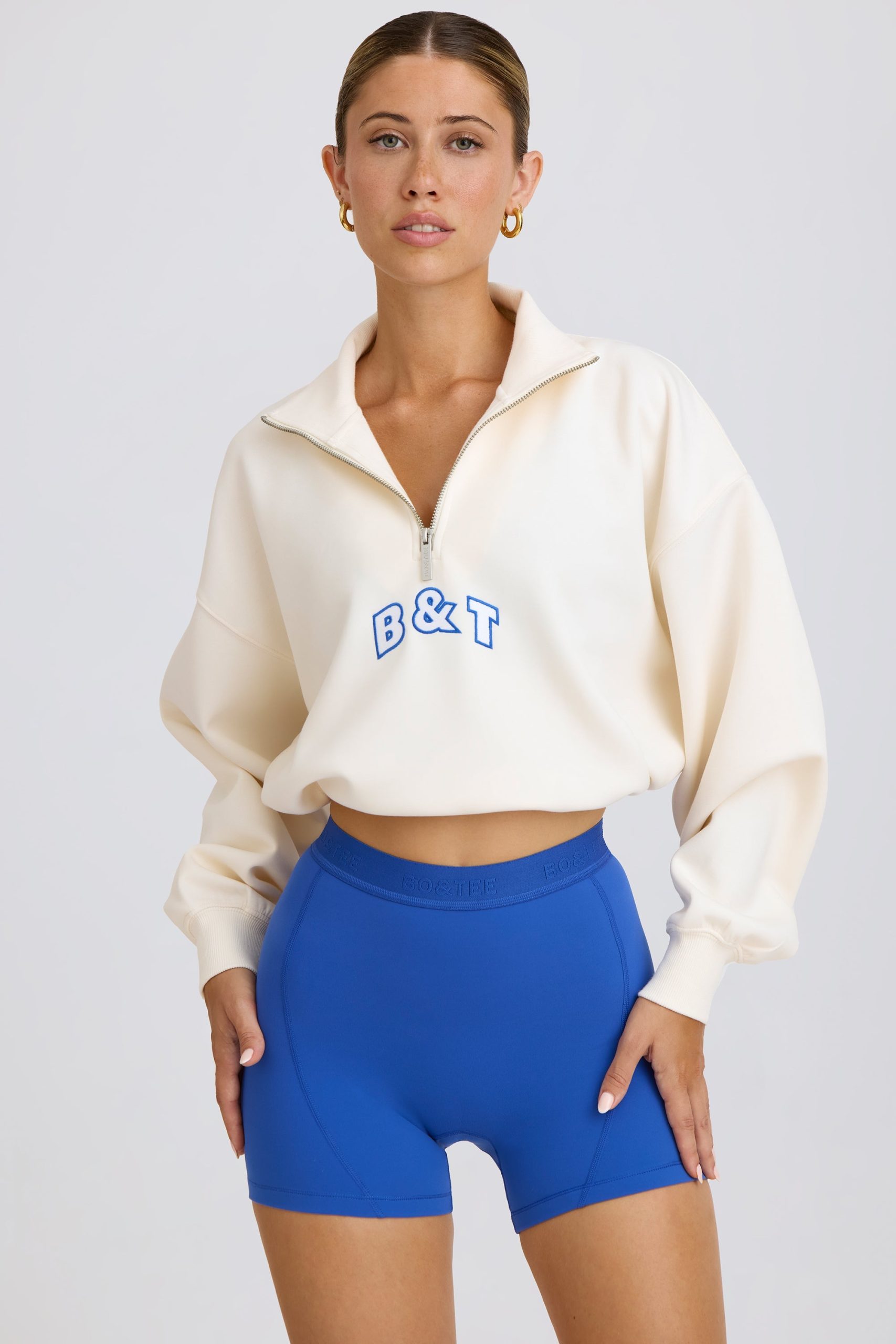 Designed with morning coffee runs and active afternoons in mind, this cropped sweatshirt is crafted from soft and slouchy scuba jersey with dropped shoulders and ribbed cuffs that enhance the laid-back look. It features an adjustable drawstring hem for custom styling, a quarter-zip fastening at the front and an embroidered Bo&Tee logo at the chest.