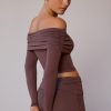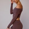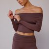 Sheer Off-Shoulder Long-Sleeve Top in Taupe Brown