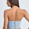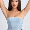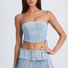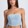 Designed to enhance classic double-denim looks, the Dalani crop top is modelled on classic corsetry. It’s crafted from premium stretch denim to a curved silhouette and framed with a bandeau neckline, complete with detachable, adjustable camisole straps for custom styling. It’s elevated with moto-inspired quilted panels and signature lace-up detailing on each side.