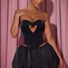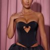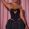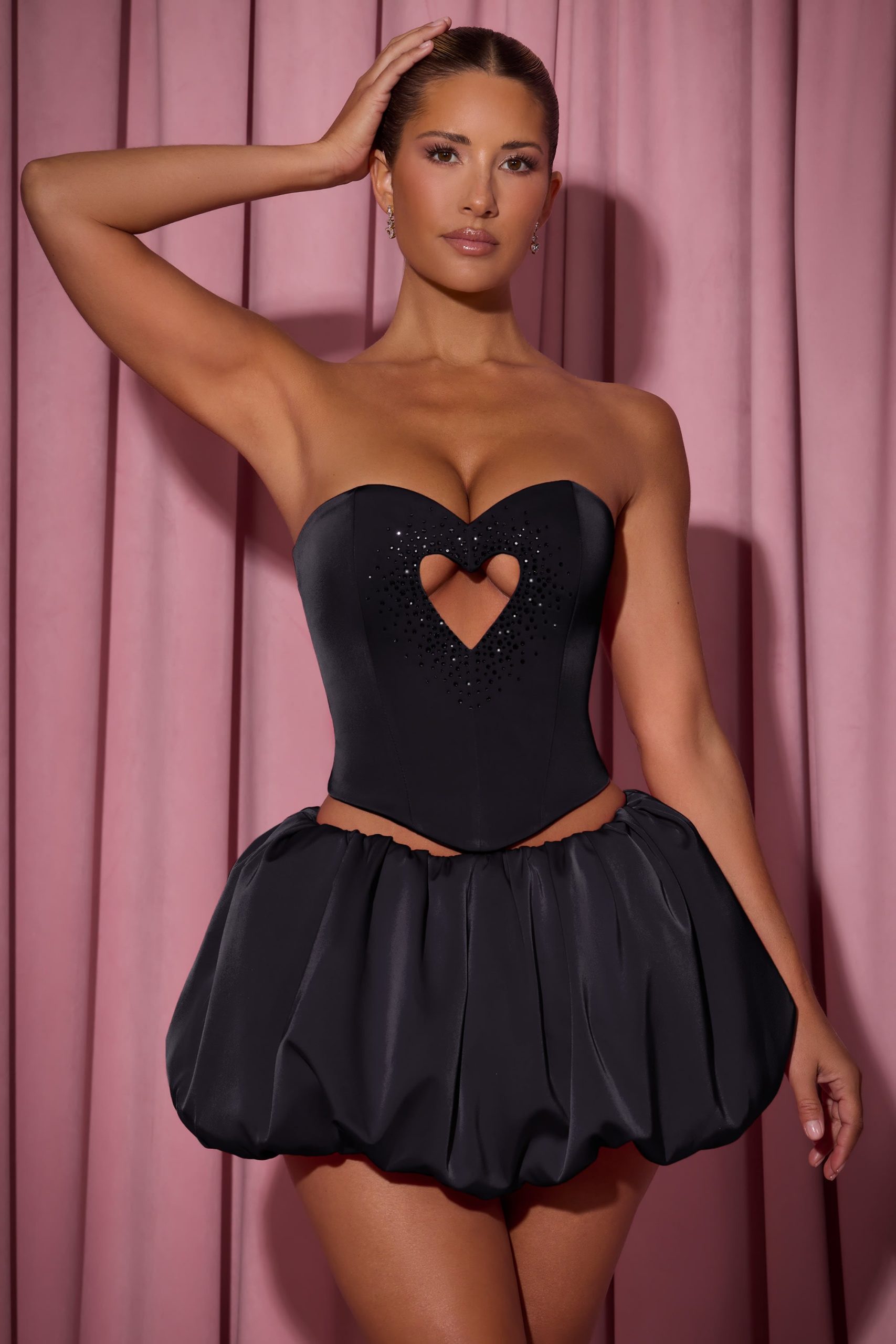 Romance in every detail. If you love statement details, then our Amora top is made for you, thanks to the heart-shaped cut-out at the front, brought to life with signature HOTFIX embellishments that sparkle under spotlights. Cut to a classic corset silhouette that sculpts and cinches your shape, complete with an adjustable lace-up back, it’s crafted from lustrous bonded satin and features a dipped hem at the front.