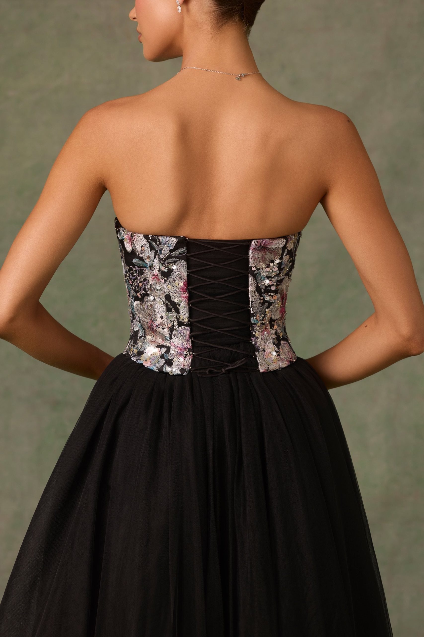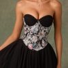 A fresh take on classic styles, the Elia corset is designed to add interest to any look. It’s crafted from figure-defining mesh fabric, overlaid with custom watercolour-inspired floral appliqués and the perfect topping of sparkling sequins. Cut to a cupless silhouette for versatile styling, it’s framed with a curved hem for instant sculpting and features an adjustable lace-up back for your perfect fit every time.