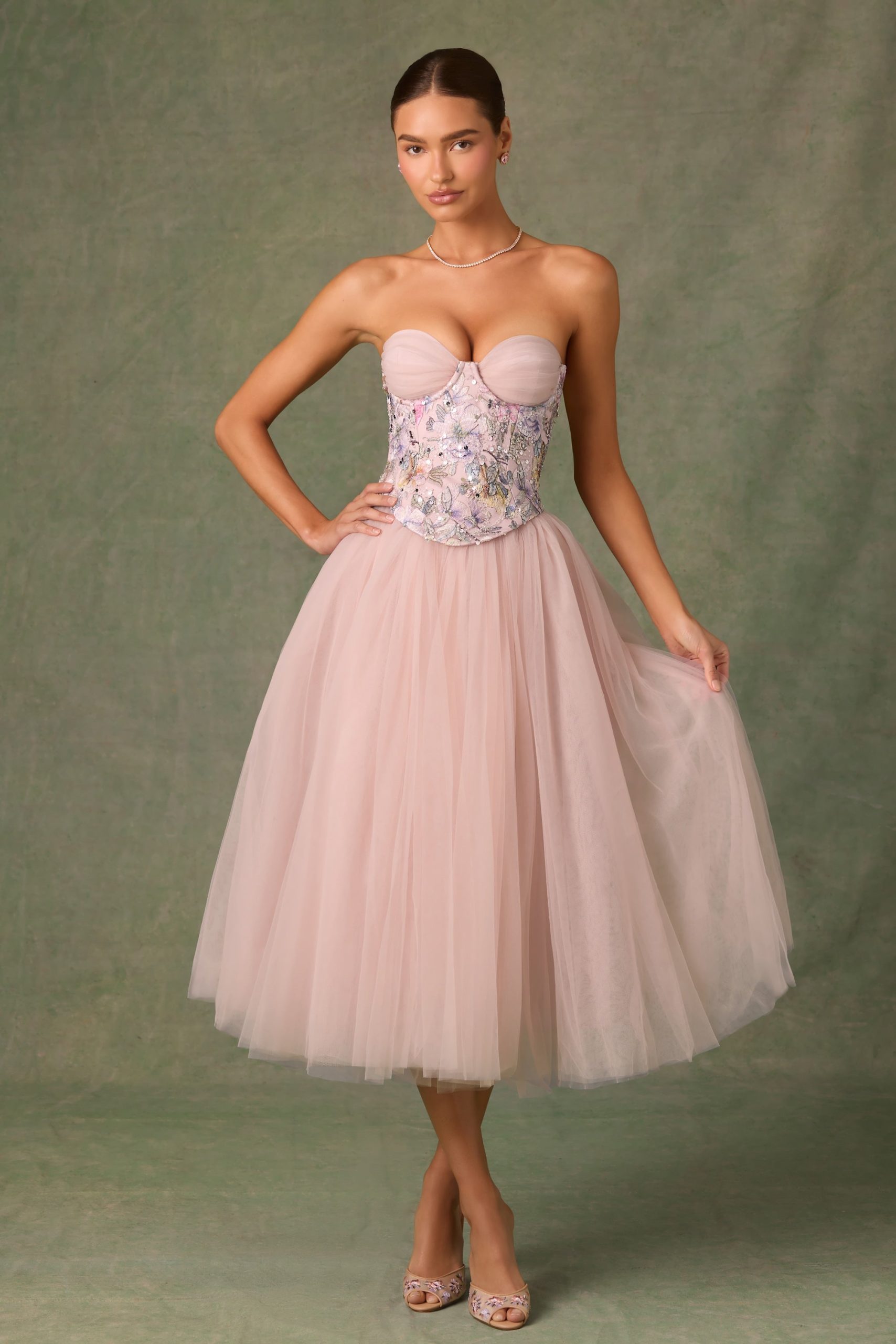 Embellished Lace-Up Cupless Corset in Floral Pink