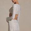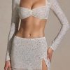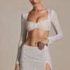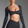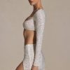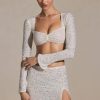 Sparkling staples. Designed to be styled with the coordinating mini skirt from the collection, the Lumina crop top is crafted from premium 20D stretch mesh to a striking cropped silhouette, complete with ruched detailing at the front. It’s framed with long fitted sleeves and adorned with signature tonal HOTFIX embellishments that glitter under the light.