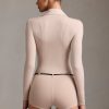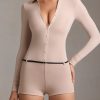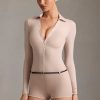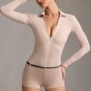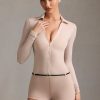 A fresh take. Designed to hug your curves to perfection, the Araceli playsuit features a collared bodice crafted from semi-sheer jersey traced with tonal buttons, inspired by classic workwear, and contrasting mini shorts made from all-new ponte fabric that’s tailored to gently contour to your curves like a second skin for the ultimate airbrushed silhouette. The slender functional belt makes the perfect finishing touch.