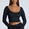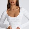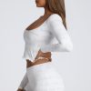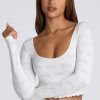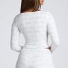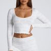 The Loungewear crop top is the perfect piece for relaxing at home. Cut close to the body and designed in our lightweight, stretchy pointelle jersey, the Loungewear crop top features all-over embossed Oh Polly branding. With a flattering scoop neck, long sleeves, and pretty lettuce hem edging, this is the lounge essential you’ll love throughout the cozy season.