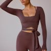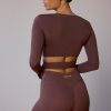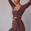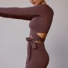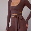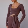 Long-Sleeve Wrap Crop Top in Taupe Brown
