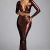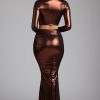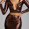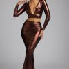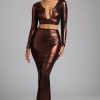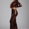 Create a memorable two-piece look with the Zahra gown skirt. A statement separate designed in our premium metallic jersey fabric, Zahra is cut close around the hips with curve-accentuating ruching and power mesh lining. Its maxi length and flattering fishtail silhouette effortlessly complements the Rana crop top.