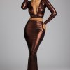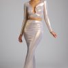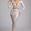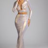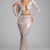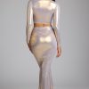 Create a memorable two-piece look with the Zahra gown skirt. A statement separate designed in our premium metallic jersey fabric, Zahra is cut close around the hips with curve-accentuating ruching and power mesh lining. Its maxi length and flattering fishtail silhouette effortlessly complements the Rana crop top.