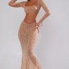 Catch the light. Designed in premium single layer stretch mesh fabric that hugs your silhouette for a curve-enhancing fit, Chiara is a maxi length design, fully hand embellished with delicate artisanal hotfix. Created to captivate, this sexy almond evening skirt is complete with a waist-cinching V-waistline and a subtle flared hemline.