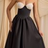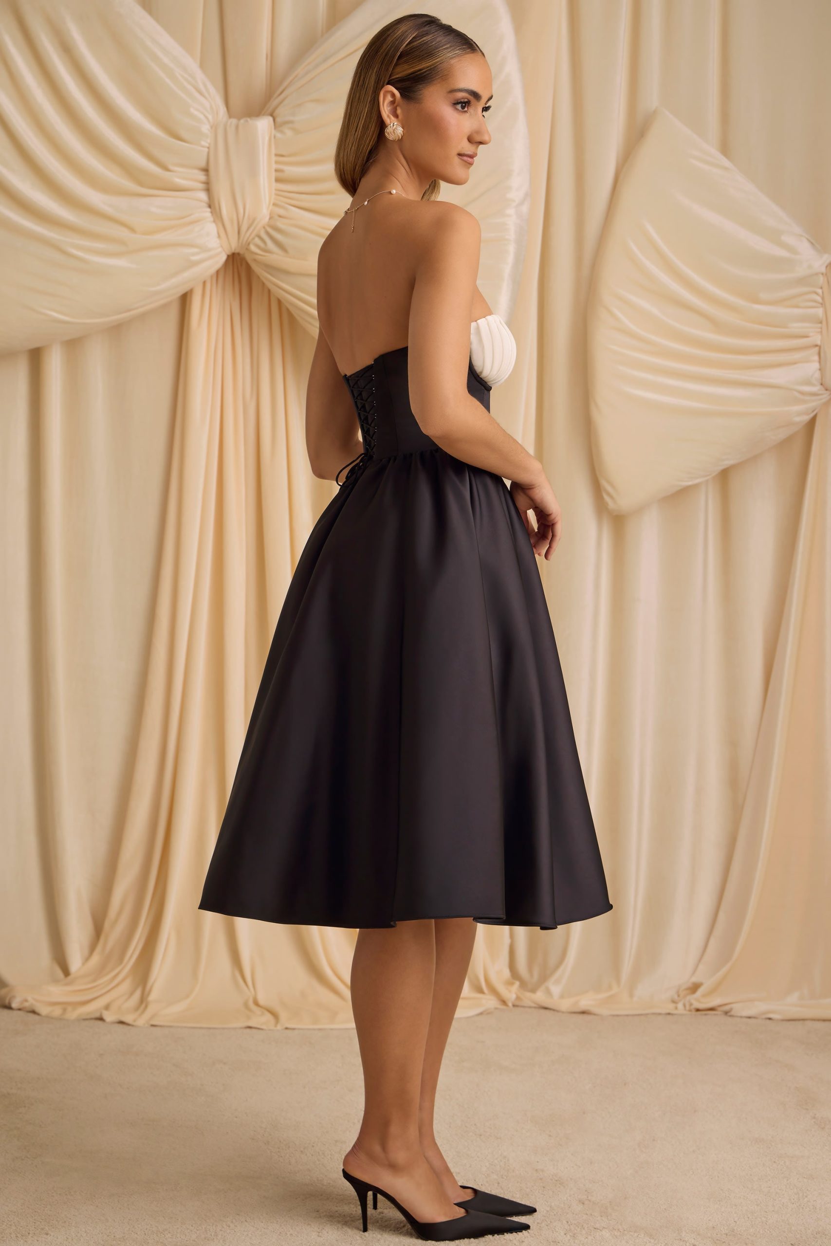 Channel classic glamour with our Gabrielle midi dress. Available in two enduring hues, it’s made from premium, non-stretch bonded satin with a built-in corset bodice for enhanced support and a gathered full skirt that creates a stunning silhouette. It’s elevated with pleated wired cups and a signature lace-up back that can be adjusted for your perfect fit.