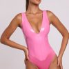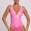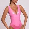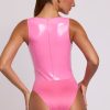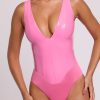 Sexy separates. Our iconic Halloween vinyl bodysuit, now available in pink. Designed to demand attention, this sleeveless bodysuit is cut from our premium light vinyl fabric and fully lined for a comfortable fit. Featuring a bust-flattering plunge neckline, bodycon fit and smooth finish that accentuates your shape.