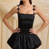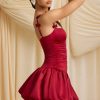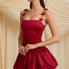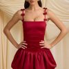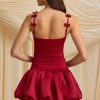 Bow-Detail Ruched Bubble Hem Mini Dress in True Red