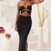 Seductive evenings in Oceane. Designed in our slinky jersey fabric, this curve-hugging maxi dress design features statement cut-outs at the waist and bust with delicate lace up detailing.
