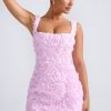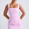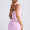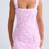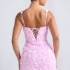 Florals that endure. Inspired by classic corsetry and couture-led elements, the Posy dress is an ethereal design, perfect for cocktail parties and evening events. It’s crafted from satin with a tulle overlay and adorned with hand-applied floral appliqués that create a stunning three-dimensional look. Cut to a mini length, it features an internal boned corset for enhanced support and turns to reveal lace-up detailing at the back.
