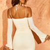 Give angel energy in the Odyssey dress, designed with flowy fluted sleeves made from luxe mesh fabric. This super stretchy style will hug the body like a glove, complete with multi straps and a bralet and cowl double neckline. Take this dress out-out with metallic platforms, loose waves and a mini grab bag.