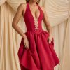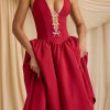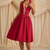 Want to stand out at any celebration? Meet the Angelina midi dress. Crafted from premium stretch woven fabric that hugs every curve, it’s cut to a classic halterneck silhouette with a fitted drop-waist bodice and voluminous gathered skirt. The plunge neckline is traced with a trio of pretty faux-pearl bows for maximum impact at your next event.