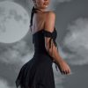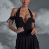Exude vintage vamp allure in the Elvyra mini dress. This premium dual layered mini dress is designed in our dual layered jersey fabric that sits comfortably against the skin with a single layered mesh overlay that adds a ghostly aspect to this statement Halloween look. Ensuring the style is spooky and seductive, Elvyra features a bust flattering lace up front and halter neckline with delicate bardot straps that fall off the shoulders. Complete with a loose fit, hanky hem skirt, Elvyra is the perfect piece to create a Halloween costume look that’s fun and flattering.