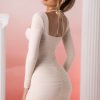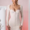 Cut from our premium stretch mesh fabric, Calista mini dress features hook and eye detailing down the front and full body ruching to cinch your waist and flatter your figure. Complete with a bust flattering sweetheart neckline and halter neck tie, Calista also features extra long ruched sleeves that finish just below the knuckle.Perfect for a romantic date night, we’re pairing our alluring mini dress with our Moment of Truth heeled mules and a chic mini clutch.