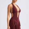 Striking silhouettes. Designed to make an impact, the Chimere mini dress is cut from our premium sheer jersey to a halterneck, A-line silhouette and enhanced with a tiered, ruffled mini skirt. Its punctuated with cut-out detailing at the front and an open back secured with a slender adjustable strap for your perfect fit.