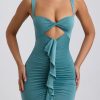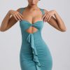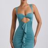 Slinky Jersey Cut-Out Ruffle-Trim Mini Dress in Sea Green