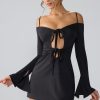 Midnight moments. Designed in a palette of sultry midnight tones, the Sidney mini dress is a statement A-line design featuring seductive front cut-outs and self-tie fastenings at the bust and waist. Cut to a mini length with off-the-shoulder long sleeves, Sidney is cut from our premium slinky jersey fabric that’s soft against the skin and super flattering.