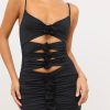 Featuring a ruched neckline and statement cut-outs from bust to hem decorated with floral adornments,