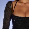 Make an entrance in the Champel maxi dress. Designed in our premium, hand embellished fabric with a soft jersey underlay that sits gently against the skin, Champel is a fully embellished design with a bust flattering cowl neckline. Multi strap detailing supports the semi sheer, split flare long sleeves whilst the semi-sheer extra long maxi skirt is complete with a leg exposing high split. Made for premium events, Champel is the must have style you need for party season and beyond.