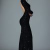 Classic silhouettes, statement details. Designed with your most memorable occasions in mind, the Leonie gown is crafted from premium, double-layered stretch fabric and saturated with scores of sparkling sequins. It’s cut to a high-neck silhouette with a statement curved cut-out at the back and a thigh-high side split.