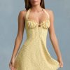 Halterneck A-Line Mini Dress in Yellow Flower Print