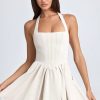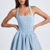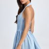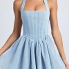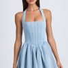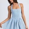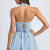 Halterneck Corset Micro Mini Dress in Light Blue Stonewash