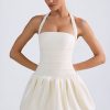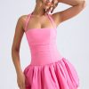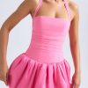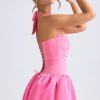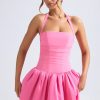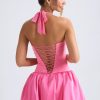 Halterneck Lace-Up Bubble Hem Corset Micro Mini Dress in Hot Pink