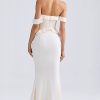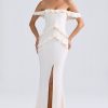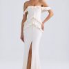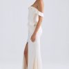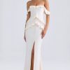 RSVP with ease. A stunning silhouette for special occasions, the Hemera gown is cut from lightweight stretch georgette to a statement off-shoulder silhouette traced with cascading ruffle trims. It features a built-in corset bodice for comfortable shaping and falls to a universally flattering fishtail skirt, complete with a thigh-high split for ease of movement.