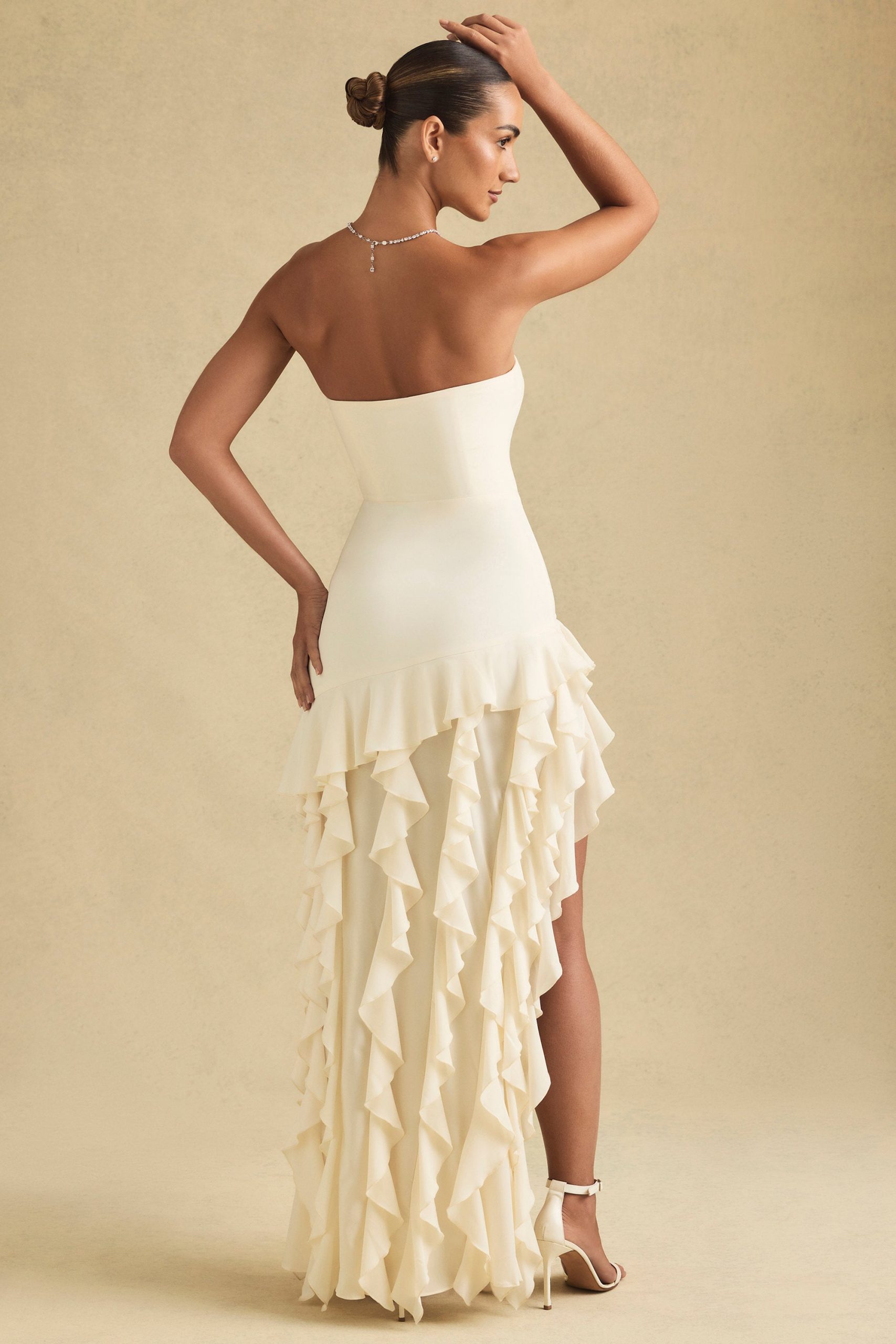 Lovingly crafted with extra-special occasions in mind, the Diletta gown is uplifted with layers of cascading ruffles that create a dynamic look with every step. It’s crafted from lightweight stretch georgette to a figure-skimming column silhouette punctuated with a thigh-high split at the side. The bandeau neckline is anchored with internal silicone tape for a secure fit.