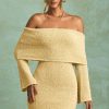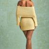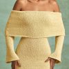 The forecast: hot. Made for warm-weather styling from day to night, the Souline mini dress is crafted from lightly textured and subtly sheer bouclé knit fabric made with cotton and a touch of stretch for a figure-skimming fit. It’s cut to an off-shoulder silhouette with an exaggerated foldover panel and flared long sleeves.