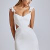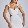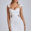 A romantic silhouette made for enchanting moments, the Rialta mini dress is designed in our premium figure-enhancing satin fabric. This stunning thigh-skimming style features a bust-flattering V neck, frilled shoulder straps, and sexy side cut-outs.
