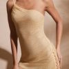 Draped across your body like a second skin, our semi sheer mesh fabric with embellished fishnet overlay is perfect for creating a glamorous and glittering festival look. We love the asymmetric neckline on the Kylie ultra mini dress that exposes a single shoulder and has delicate dual spaghetti straps that accentuate the right shoulder. The body skimming fit of the Kylie mini dress is accentuated with a thigh skimming, asymmetric a-line mini skirt that’s complete with seductive lace up detailing to the side.