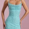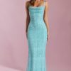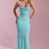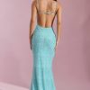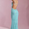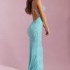 Embellished Cowl-Neck Backless Maxi Dress in Aqua Blue