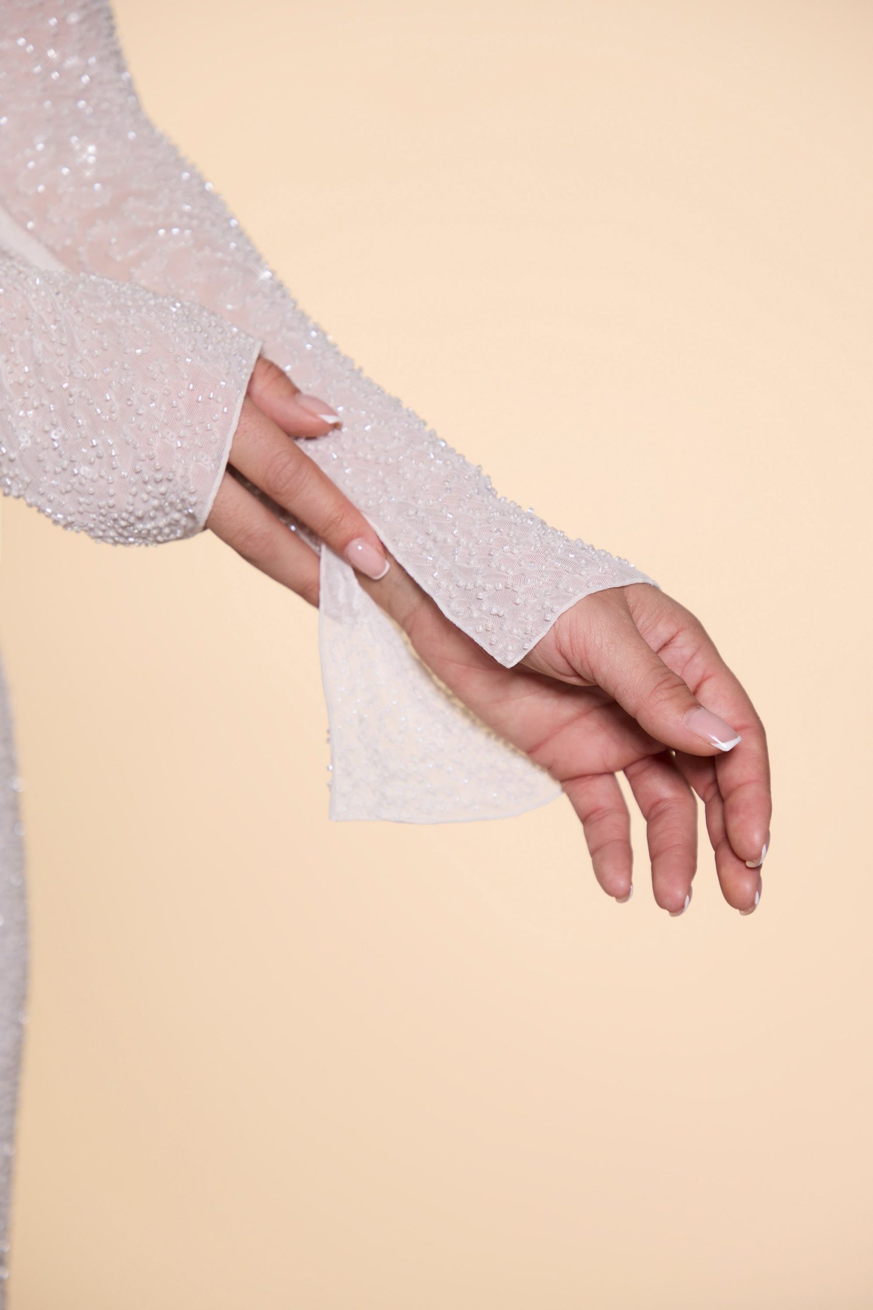 Make an entrance in the Champel maxi dress. Designed in our premium, hand embellished fabric with a soft jersey underlay that sits gently against the skin, Champel is a fully embellished design with a bust flattering cowl neckline. Multi strap detailing supports the semi sheer, split flare long sleeves whilst the semi-sheer extra long maxi skirt is complete with a leg exposing high split. Made for premium events, Champel is the must have style you need for party season and beyond.