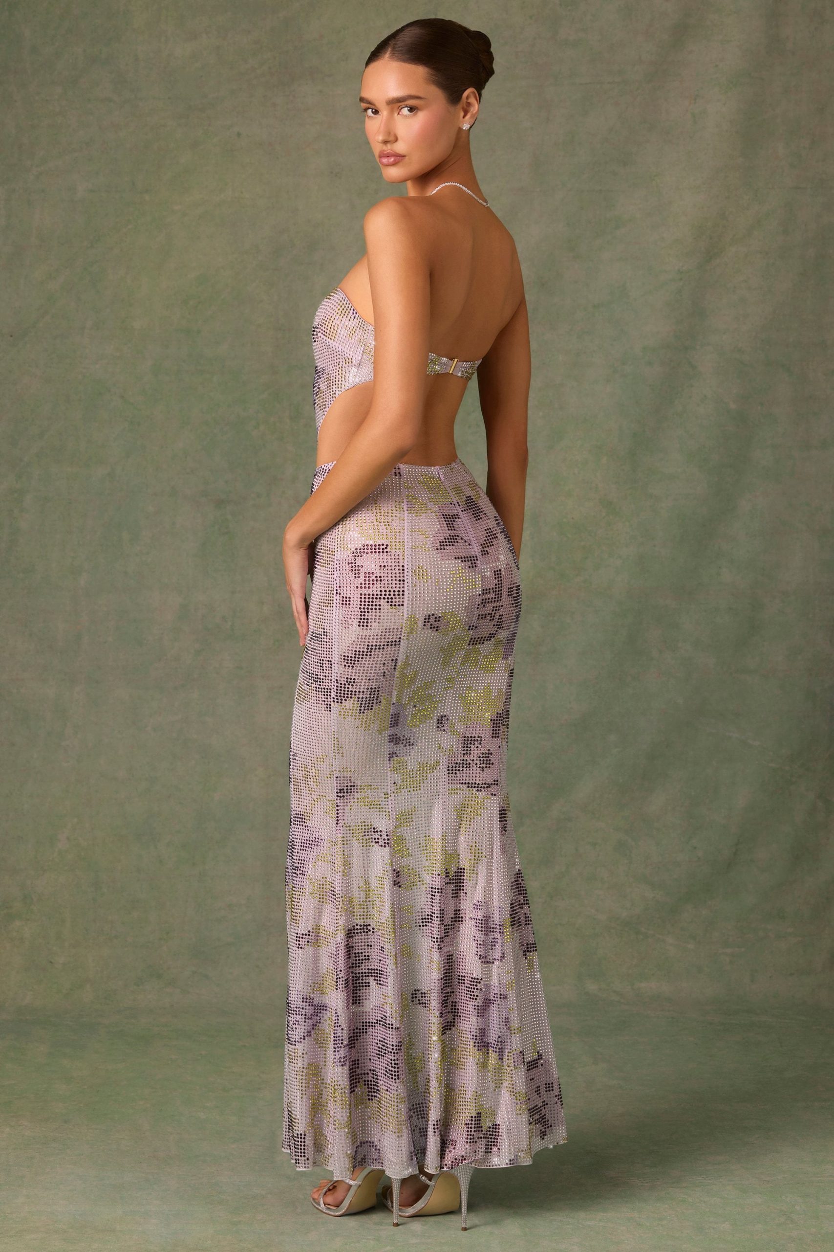 Hyper-feminine florals meet artisanal embellishment with the Lucienne maxi dress. Crafted from a premium dual-layered mesh that hugs your curves, it’s elevated with signature HOTFIX crystals, precisely placed to create a watercolour-inspired rose design. It features a flattering bandeau neckline secured with silicone grip tape and a stunning backless design for maximum impact. The detachable, adjustable camisole straps ensure multiple styling options and the perfect amount of support.
