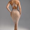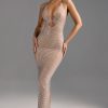 Unique silhouettes for maximum impact. Statement eveningwear is our forte and the Akiko maxi dress is proof: it’s crafted from premium 20D mesh to a sculpting bodycon silhouette, underlaid with a lightweight single-layer lining, and adorned with scores of hand-embellished HOTFIX crystals that provide endless sparkle. The plunging neckline and triangle cut-out are mirrored at the back for a striking finish.