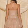Embellished Halterneck Bubble Hem Mini Dress in Almond