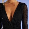 Designed with an undeniably flattering wrap over neckline that exposes a flirtatious amount of skin, the Chelsea mini dress features a heart stopping a-line skirt with full split that exposes your left leg. Fully embellished with pearl and bead adornment and complete with a semi sheer mini skirt and split flare sleeves, Chelsea is all about the finer details. Complete with a built in bodysuit, Chelsea is the ultimate party dress for your most premium events this season.