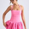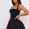 Playful silhouettes for memorable nights. The Ludmila mini dress is crafted from sumptuous georgette and satin to a structured bubble hem silhouette, complete with matching jersey shorts to temper the micro mini length. It’s framed with an adjustable halterneck for a supportive fit and is complete with corset-inspired lace-up detailing at the back.