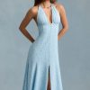 Romance in every detail. Crafted from lightweight stretch georgette and decorated with the prettiest floral print, the Elonia midaxi dress is cut to a figure-skimming A-line silhouette with adjustable halterneck straps. The fabric-covered buttons, plunging neckline and open back are the perfect finishing touches.