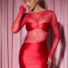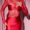 Love at first sight. A style they’ll be thinking about long after the evening is over, the Eliette mini dress is crafted from premium stretch-jersey with a high-shine finish and elevated with semi-sheer floral lace panels that highlight your decolettage, waist and back for a romantic look. Framed with a high boat neck and long sleeves, it’s complete with ruched detailing at the bust and skirt.