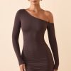 Modal Off-Shoulder Ruched Mini Dress in Chocolate Brown