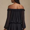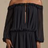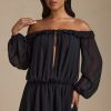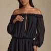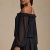 Spring moments, elevated. Lightweight and breezy, the Solana mini dress is crafted from premium chiffon to a relaxed off-shoulder silhouette with oversized balloon sleeves. It features an elasticated waist, plunge keyhole cut-out at the front and an asymmetric tiered skirt. The neckline is traced with pretty ruffles and features functional lace-up ties for a custom look.