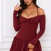 Off-Shoulder Tiered Corset Mini Dress in Berry Red