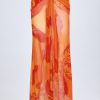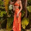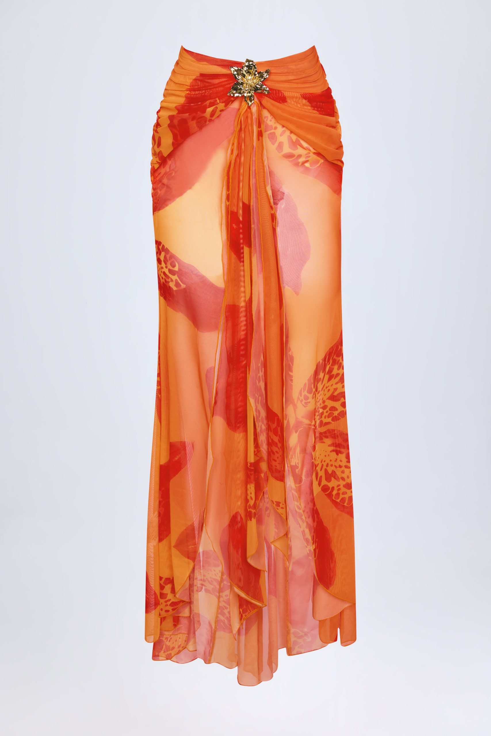 A sheer moment. The Bacalar maxi skirt is crafted from premium, ultra-light 20D stretch mesh for a barely-there feel and maximum impact on your next tropical getaway. Cut to a low-rise silhouette, it features a figure-flattering dipped V-waist, partially lined ruched overlay and a high-low fishtail hem with godet detailing for dynamic movement with every step. It’s embellished with custom floral hardware at the front that pairs back perfectly with our swim separates for a complete resort look.